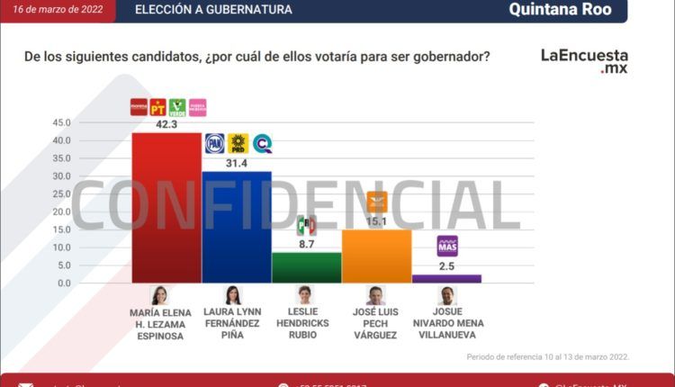 La encuesta publicada el 13 de marzo de la empresa Opinión Pública Marketing e Imagen/Heraldo Media Group muestra que con el respaldo de Morena-PT-PVEM, Mara Lezama, en Quintana Roo, aventaja con 33.5 por ciento, es decir, 10.3 puntos porcentuales más que Laura Fernández, del PAN-PRD, quien obtuvo 23.2 por ciento de la preferencia ciudadana.