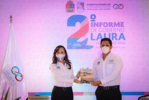 Puerto Morelos, Quintana Roo, 11 de septiembre de 2020.- En Puerto Morelos trabajamos con la idea firme de fortalecer una administración de vanguardia, incluyente y transparente para cambiar las condiciones de vida de todos los habitantes, destacó la alcaldesa Laura Fernández Piña al rendir su Segundo Informe de Gobierno, que atestiguó el gobernador Carlos Joaquín González por medio de una video conferencia.