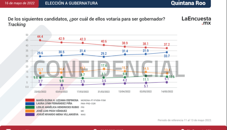 La encuesta coloca a Leslie Hendricks, del PRI con 10.6 por ciento de preferencia, José Luis Pech Varguez con 13.4 por ciento y Josué Nivardo Mena Villanueva con 5.1 por ciento.