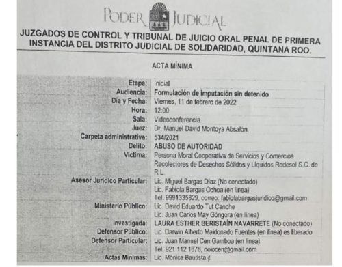 PLAYA DEL CARMEN, MX.- La ex presidente municipal de Solidaridad, Laura Beristain Navarrete, quedó vinculada a proceso hoy, acusada de abuso de autoridad, en perjuicio de la concesionaria Redesol, luego de una audiencia virtual a la que ella no se presentó.La denuncia fue realizada por esta empresa, y clasificada por la Fiscalía General del Estado con la carpeta 94/2019. Esto, debido a que la ex edil de Morena determinó la suspensión de su concesión, del servicio de recolección de basura, sin obtener autorización de Cabildo.La audiencia de vinculación fue iniciada ayer, pero fue suspendida y retomada hoy desde las 10 de la mañana. Presentes estuvieron la parte agraviada, sus abogados, el abobado defensor de Beristain Navarrete y un defensor público. La investigada nunca se conectó a la videoconferencia.