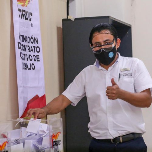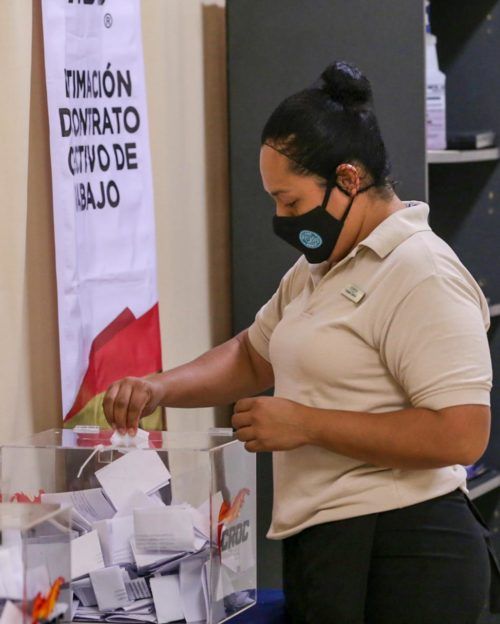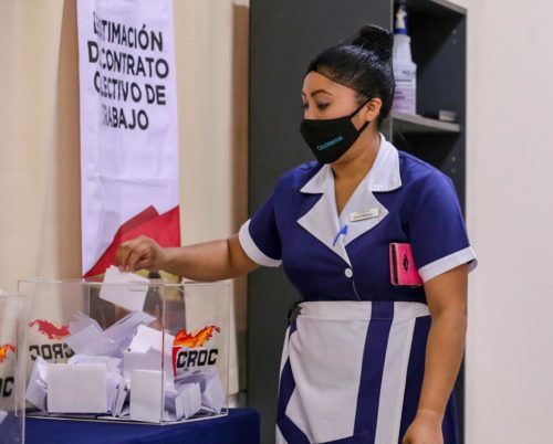 Playa del Carmen, Quintana Roo, 8 de abril de 2021.- Las y los trabajadores del Hotel Occidental Xcaret participaron este día en una consulta democrática, donde mediante voto, libre, personal, directo y secreto decidieron por la legitimación de su contrato colectivo de trabajo (CCT).