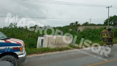 Cancún, Quintana Roo, 3 de diciembre 2020.- Cuerpos de emergencia acudieron a atender el reporte de una camioneta de la empresa Sigma volcada a un costado de la carretera Leona Vicario-Cancún