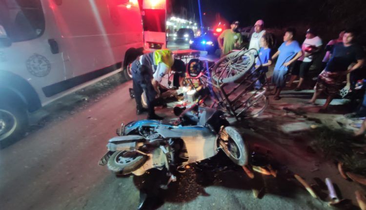 Playa del Carmen.- Fuerte accidente se registró en las inmediaciones del asentamiento irregular conocido como in-house, donde joven menor de edad abordo de una motocicleta inpacto el triciclo de un panadero a quien le dejó fractura expuesta en tibia y peroné.