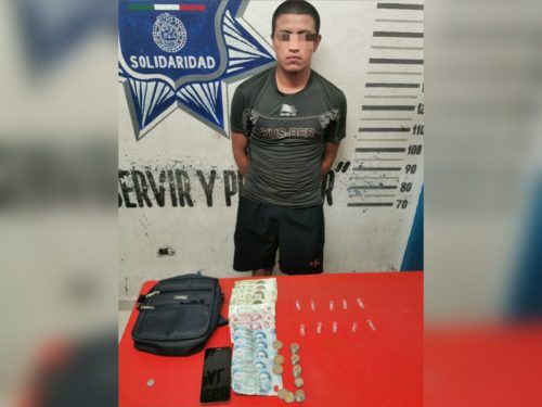 Playa del Carmen, Solidaridad a 28 de octubre de 2021.- Elementos de la Secretaría de Seguridad Pública y Tránsito Municipal de Solidaridad, aseguraron a una persona en posesión de 10 bolsas con una sustancia con las características de la droga conocida como crack, en la colonia Colosio.