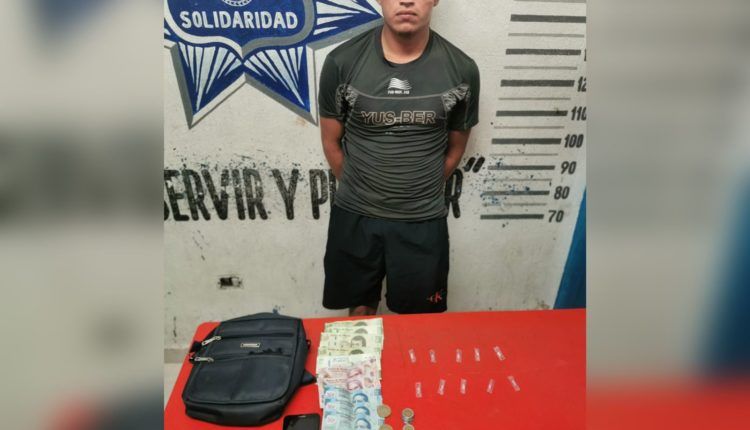 Playa del Carmen, Solidaridad a 28 de octubre de 2021.- Elementos de la Secretaría de Seguridad Pública y Tránsito Municipal de Solidaridad, aseguraron a una persona en posesión de 10 bolsas con una sustancia con las características de la droga conocida como crack, en la colonia Colosio.
