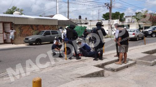 Cancún, Quintana Roo, 8 de abril 2021.- Dos elementos de la unidad motorizada marcada con el número 808 de Seguridad Pública de Benito Juárez sufrieron un accidente vial al conducir a exceso de velocidad y tratar de evitar colisionar contra un automóvil particular.