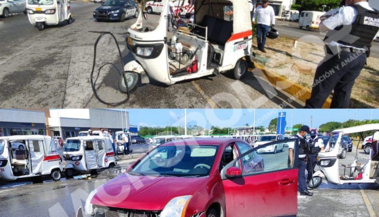 Playa del Carmen, Solidaridad, 14 de octubre d 2021.- La falta de precaución del conductor de un mototaxi al realizar un cambio de dirección cuando circulaba en la avenida Los Gavilanes, ocasionó que fuera colisionado por un automóvil particular que lo proyectó contra el pavimento.