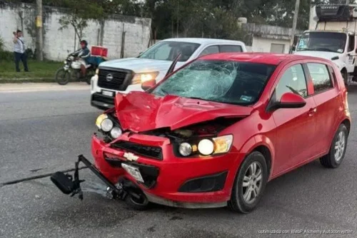 De acuerdo con reportes preliminares, el accidente ocurrió alrededor de las 7:00 de la mañana, a la altura de la avenida Chemuyil, cuando la conductora del vehículo ligero intentó cruzar el bulevar y fue impactada por un automóvil particular, un Chevrolet Sonic color rojo.