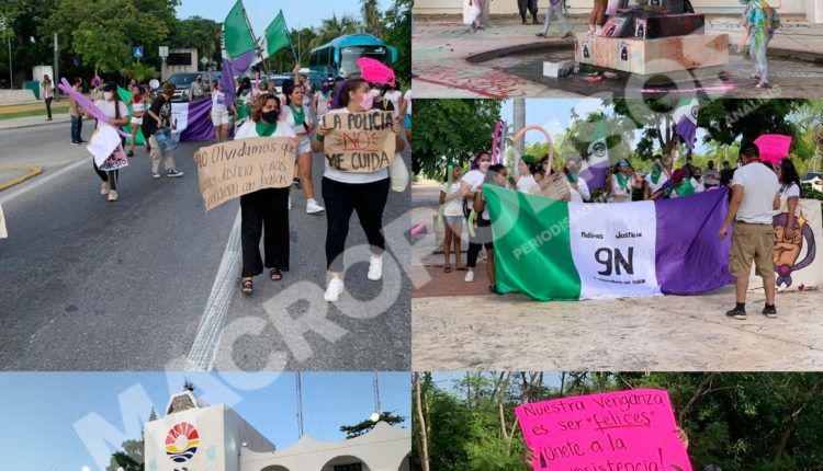 Cancun, 10 de julio de 2021.- Un contingente feminista salió nuevamente a las calles de este destino para manifestarse por los hechos perpetrados el pasado 9 de Noviembre, en sus demandas volvieron a pintar el Palacio Municipal.
