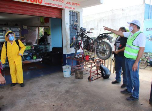 Las labores de desinfección abarcaron negocios como El Campi, GM Motoservicio, Herrería José, El Che, dos tiendas de abarrotes, papelería Belem, carnicería Lázaro, Rectificadora de Autos y los templos Getsemani y Rosa de Sarón.