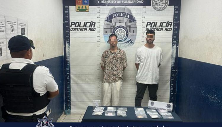 Playa del Carmen.- Con el reforzamiento de vigilancia y la rápida atención a los reportes ciudadanos, la Policía Municipal de Solidaridad aseguró a dos sujetos procedentes de Argentina en posesión de posibles drogas como cocaína, pastillas y metanfetamina.