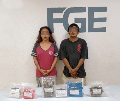 Por otra parte, elementos de la Policía de Investigación detuvieron a José Manuel “N”, Claudia Paola “N” en el Fraccionamiento Palmas 1. Durante la inspección de rigor, se les encontraron bolsitas transparentes con sustancia cristalina, parecido al cristal y hierba verde y seca con las características propias a la marihuana.