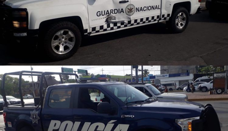 Playa del Carmen, a 11 de junio de 2021. – Un encontronazo protagonizaron los vehículos de la Guardia Nacional al chófer contra la unidad de la Policía Municipal de Solidaridad en el cruce del Boulevard Playa del Carmen y avenida 28 de Julio, la mañana de este viernes.