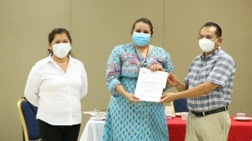 Playa del Carmen, Solidaridad, Quintana Roo, 01 de septiembre de 2021.- El secretario general de la CROC Quintana Roo, Martín de la Cruz Gómez hizo entrega del nombramiento como presidenta de la asociación civil Avanzamos Promoción Social CROC, en la zona sur del Estado a Belem Elena Iuit Pantoja.