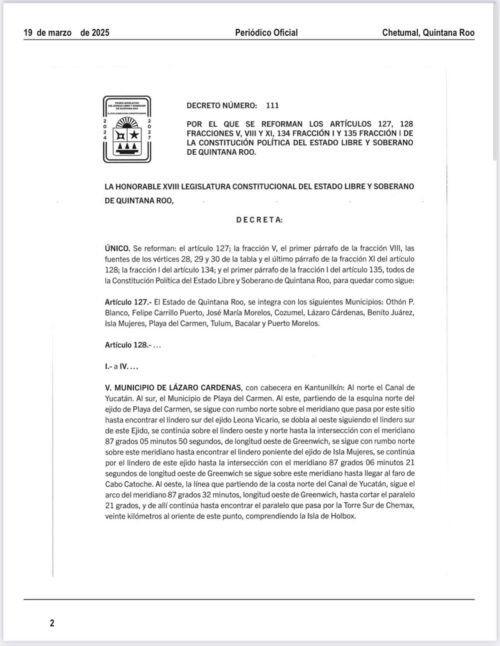 El decreto está registrado en el tomo primero, número 57 extraordinario de la décima época del Periódico Oficial del Estado de Quintana Roo, y con ello se oficializa el nuevo nombre del municipio, consolidando su identidad como un destino de referencia en México y el mundo.