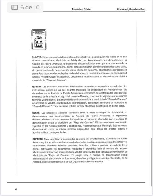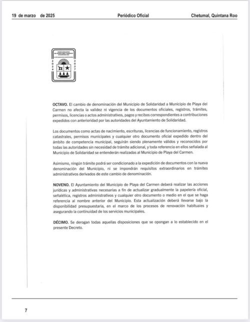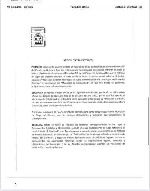 Asimismo, el decreto establece que cualquier referencia legal o administrativa al municipio de Solidaridad, su ayuntamiento o sus autoridades municipales, deberá entenderse como aplicable a Playa del Carmen, sin necesidad de trámites adicionales.