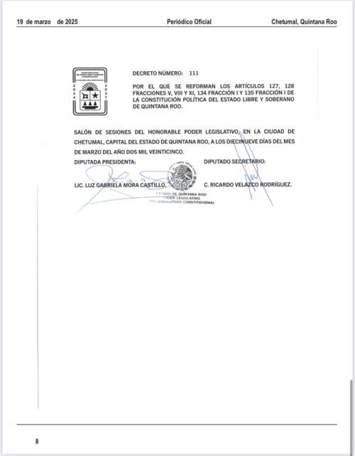 El cambio quedó plasmado en la reforma de los artículos 127, 128 (fracciones V, VIII y IX), 134 fracción I y 135 fracción I de la Constitución Política del Estado Libre y Soberano de Quintana Roo.