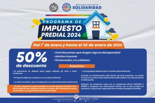 Durante el periodo del 1 al 30 de enero de 2024, los contribuyentes recibirán un descuento del 25%. Asimismo, del 31 de enero al 29 de febrero de 2024, se aplicará un descuento del 15%. Es importante destacar que estos beneficios estarán sujetos a la condición de que la propiedad no presente adeudos de 2023 o años anteriores y debe realizarse el pago total del impuesto predial en una sola exhibición.