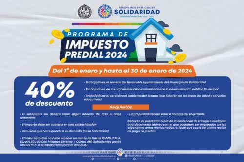 Playa del Carmen, Solidaridad, 28 de diciembre de 2023.- Para respaldar la economía y facilitar el cumplimiento de obligaciones tributarias de las y los solidarenses, la administración municipal dirigida por la presidenta Lili Campos otorga descuentos en el pago del impuesto predial 2024 a los propietarios, poseedores o fiduciarios de propiedades inmobiliarias, siempre y cuando el pago sea cubierto en una sola exhibición y se cubra todo el ejercicio fiscal del año.