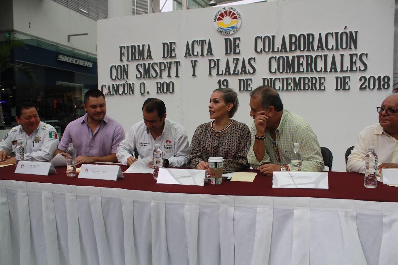 Cancún, Q. Roo. 19 de diciembre 2018.— La Secretaría Municipal de Seguridad Pública y la Asociación de Plazas Comerciales suscribieron hoy un acuerdo de colaboración que permitirá a los agentes de la corporación entrar a los estacionamientos de éstas para prevenir hechos delictivos en esos espacios e imponer multar a quienes hacen mal uso de esas áreas.