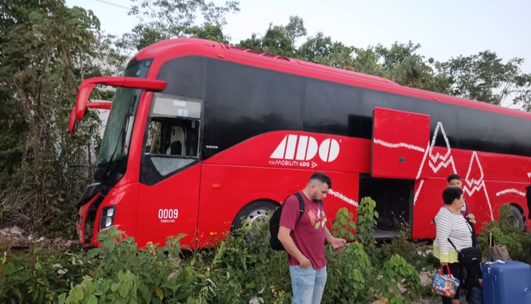 Playa del Carmen, 16 de julio del 2023 (Macropolis QR).- Pasajeros provenientes de la ciudad de Mérida abordo de un camión de la empresa ADO sufrieron aparatoso accidente sobre la autopista El Tintal, por fortuna no hubo lesionados solamente daños materiales.