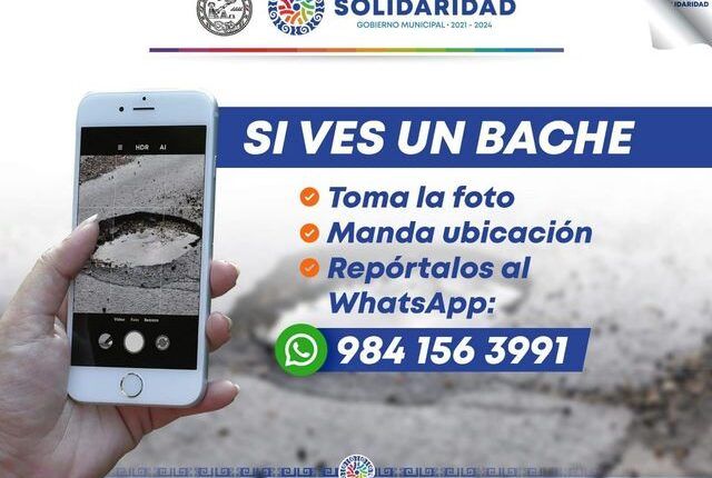Los constantes aguaceros han provocado la aparición de baches en áreas muy transitadas como calles y avenidas, pero también en accesos como al interior de colonias y fraccionamientos. Por ello, se solicita a los residentes que tomen una foto de los baches y los envíen junto con la ubicación por WhatsApp al número 984 156 3991, para que puedan ser reparados lo antes posible, siempre que las condiciones climáticas lo permitan.