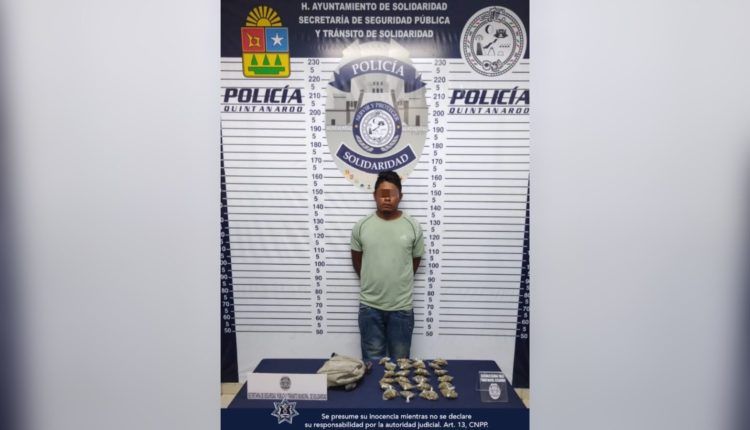 Playa del Carmen.- Un sujeto fue asegurado en posesión de 24 bolsitas con posible marihuana, por policías de la Secretaría de Seguridad Pública y Tránsito Municipal de Solidaridad durante un operativo de vigilancia en la colonia Centro.