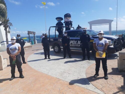 Puerto Morelos, Quintana Roo, 6 de febrero de 2021.- La presidenta municipal, Laura Fernández Piña, destacó la participación este fin de semana de un grupo de elementos de la Policía Quintana Roo de Puerto Morelos y de la Guardia de Atención Ciudadana de la Secretaría de Seguridad Pública del Estado que se unió a la difusión de medidas preventivas contra el Covid-19.