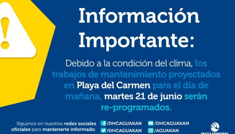 Playa del Carmen.- Debido a las condiciones meteorológicas y el pronóstico del tiempo, Aguakan ha reprogramado los trabajos de mantenimiento preventivo en la infraestructura hidráulica de la zona de captación de Playa del Carmen que se tenían proyectados para este martes 21 de junio; por motivos de seguridad, no es posible realizar con lluvia los trabajos en las estaciones de energía y cableado.