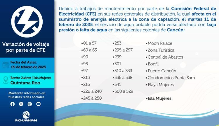 Cancún- Debido a trabajos de mantenimiento por parte de la Comisión Federal de Electricidad (CFE) en sus redes generales de distribución, la cual afecta en el suministro de energía eléctrica en la zona de captación, el martes 11 de febrero, el servicio de agua potable podría verse afectado en algunas colonias de Cancún.
