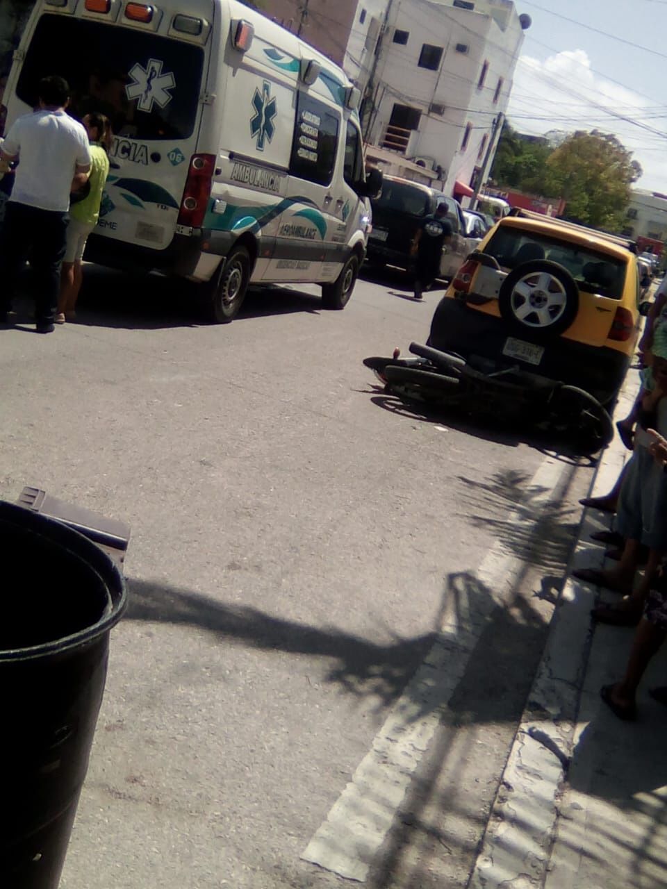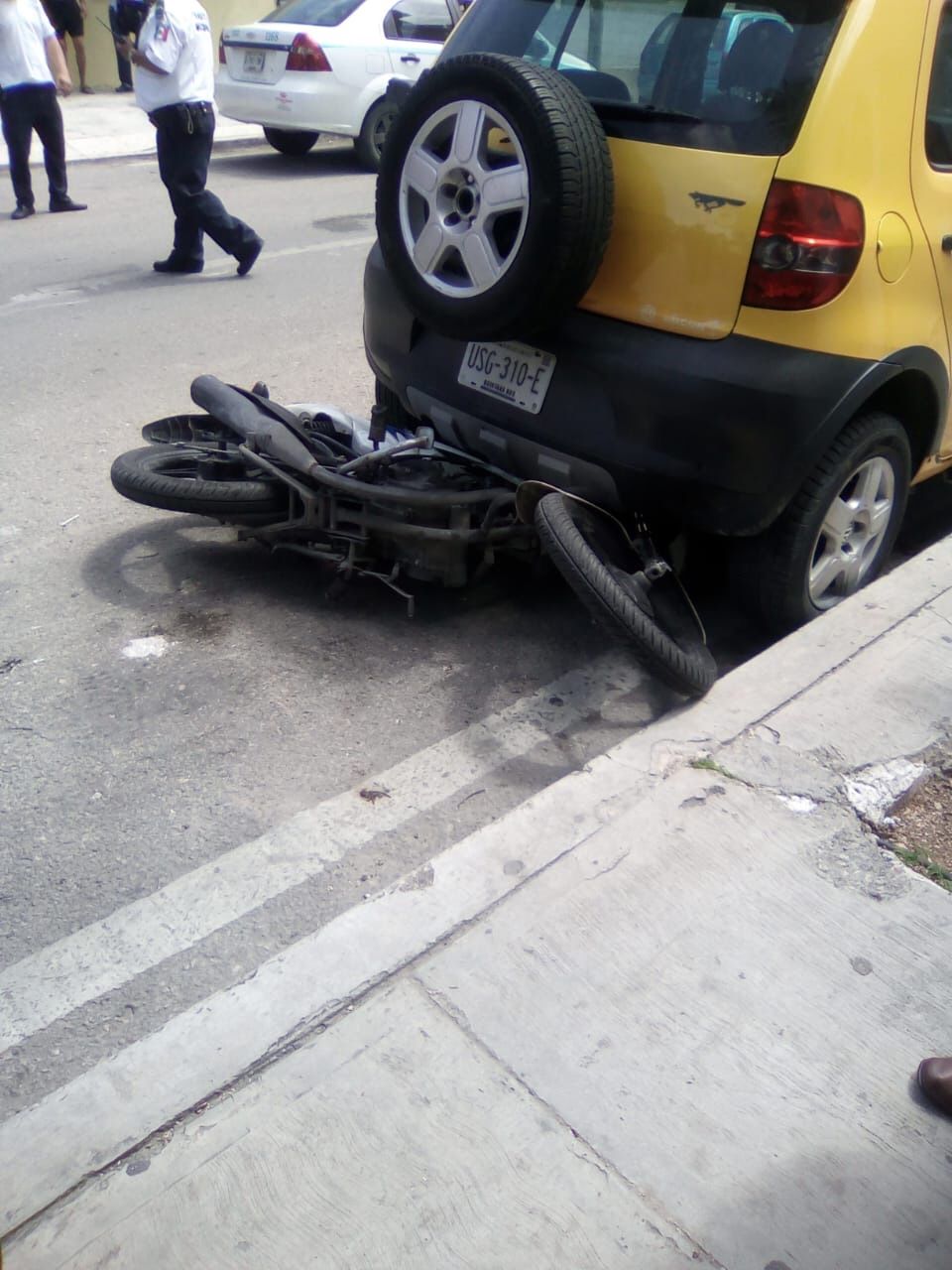 Playa del Carmen, Q. Roo, 20 de septiembre 2018.- El conductor de un automóvil Cross Fox amarillo placas de circulación USG-310-E embistió, al parecer de manera premeditada, a un motociclista dejándolo con lesiones y su moto prácticamente inservible. Durante el percance que se registró en ls calle 26 Avenida entre 30 y 35 Norte en la Colonia Gonzálo Guerrero, cerca de las oficinas de la Comisión Federal de Electricidad (CFE), el conductor de auto particular intento darse a la fuga pero un taxista le impidió el paso hasta que llegaron los elementos de la Policía y Tránsito Municipal.