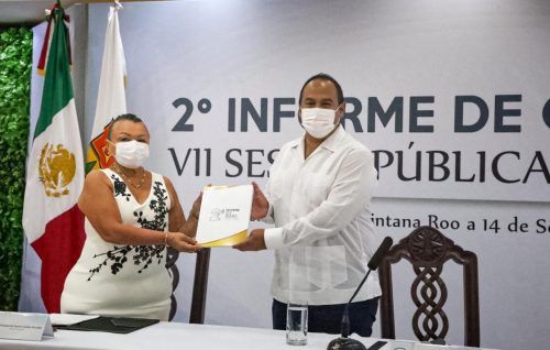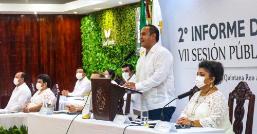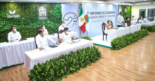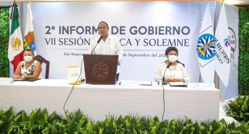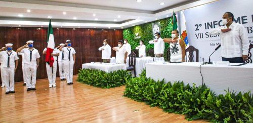 Isla Mujeres, Quintana Roo, 14 de septiembre de 2020– Dentro del marco de la Séptima Sesión Pública y Solemne de Cabildo y, debido a la Nueva Normalidad, acompañado vía remota por titulares de los tres órdenes de gobierno, Carlos Joaquín González, gobernador constitucional del Estado, Erick Gustavo Miranda García, presidente de la Junta de Gobierno y Coordinación Política de la XVI Legislatura y José Antonio León Ruiz, Magistrado presidente del Tribunal Superior de Justicia del Estado; el presidente municipal de Isla Mujeres Juan Carrillo Soberanis, llevó a cabo su Segundo Informe de Gobierno2018-2021 donde enfatizó el trabajo realizado en beneficio de las familias isleñas.