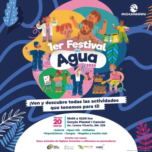 El Primer Festival del Agua se llevará a cabo el viernes 20 de marzo en las instalaciones del Cecyte Plantel 1 Cancún, donde niñas, niños, jóvenes y adultos podrán participar en una jornada llena de actividades educativas y recreativas.