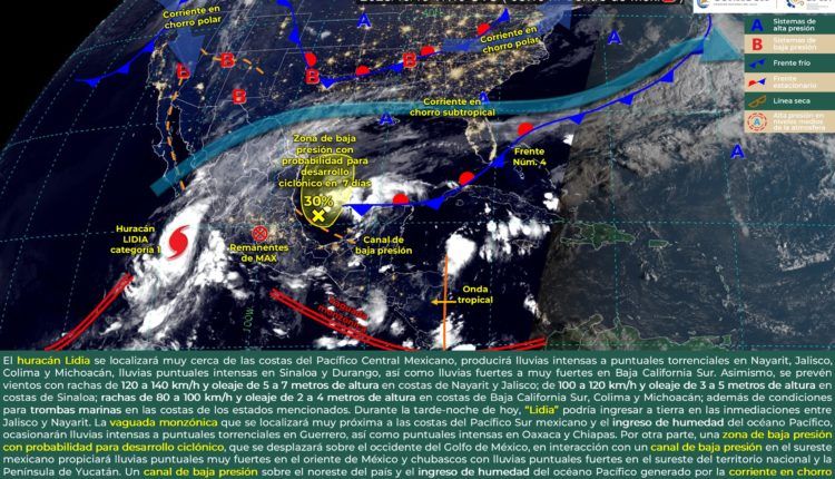 El huracán Lidia se localizará muy cerca de las costas del Pacífico Central Mexicano, producirá lluvias intensas a puntuales torrenciales en Nayarit, Jalisco, Colima y Michoacán, lluvias puntuales intensas en Sinaloa y Durango, así como lluvias fuertes a muy fuertes en Baja California Sur.