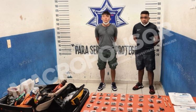 Playa del Carmen, Solidaridad a 7 de octubre.- A través de las cámaras del C4 fueron identificados dos sujetos denunciados por robo en la modalidad de “cristalizos” a vehículos, esto, en el estacionamiento de la plaza Centro Maya, por lo que la Policía Municipal desplegó un operativo de manera inmediata que resultó en el aseguramiento de los hombres a quienes se le encontró entre sus pertenencias 41 bolsas y 4 envoltorios de papel cigarro con vegetales color verde similar a la marihuana.