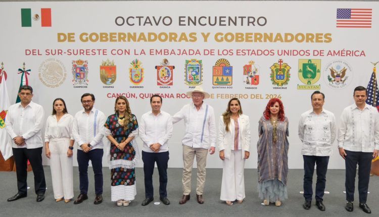 Cancún.- Las Gobernadoras y Gobernadores del Sur-Sureste de México y la Embajada de Estados Unidos firmaron el Memorándum de Entendimiento para impulsar el crecimiento equitativo e inclusivo de la región, además avanzan en el trabajo de temas prioritarios como la seguridad, economía, medio ambiente y educación.