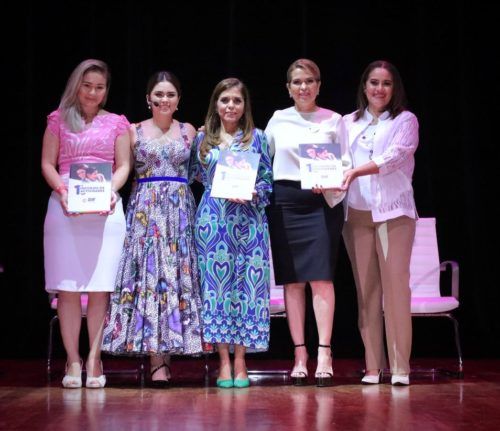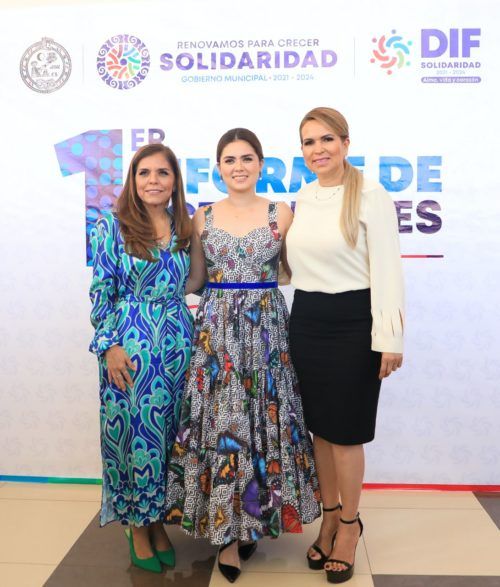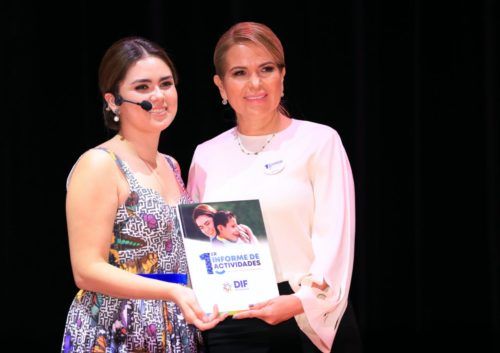 A la presidenta honoraria del Sistema DIF Quintana Roo, Verónica Lezama, y a la presidenta Lili Campos, Rosita Escobedo les entregó el libro que contiene las actividades realizadas durante el primer año de actividades.