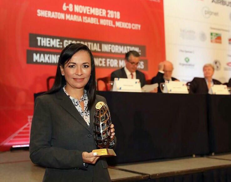 Ciudad de México, 6 de noviembre de 2018.- La alcaldesa de Puerto Morelos y presidenta de la Conferencia Nacional de Municipios de México (Conamm), Laura Fernández Piña, recibió este día el “Latin America Geospatial World Excellence Award”, en la categoría de Premio a la Excelencia de Aplicaciones Geoespaciales por el programa de Modernización Catastral: Sistema Geográfico de Gestión, Mapas Web y Geo Business Intelligence.