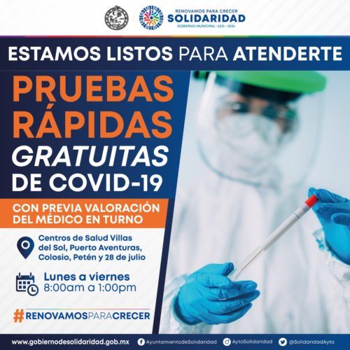 Finalmente, al destacar que actualmente se cuenta con un promedio de mil pruebas disponibles, Castro Jiménez indicó que éstas se encuentran disponibles, bajo previa indicación y diagnóstico médico, para nacionales y extranjeros, en los centros de salud de Villas del Sol, Puerto Aventuras, Colosio, Peten y la colonia 28 de Julio, en horario de lunes a viernes, de 8:00 a.m. a 1:00 p.m.