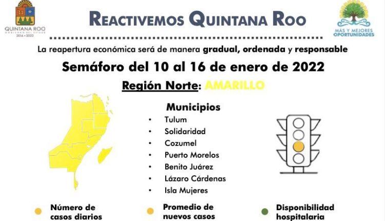 El amarillo estará vigente del 10 al 16 de enero próximos en las dos regiones del estado, el sur y el norte, por lo que se reducirán los aforos con base en el programa Reactivemos Quintana Roo para la reapertura gradual, ordenada y responsable.