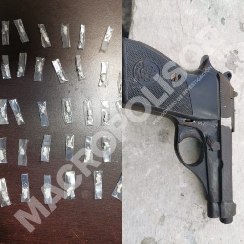 Los masculinos agredieron verbalmente a los policías municipales e intentaban impedir que se procediera con la detención de Sebastián “N”, sin embargo, se le encontró en la mariconera el arma Pietro Beretta, tipo escuadra, color negro, un cargador y cinco cartuchos asimismo en la bolsa derecha de su pantalón le fue encontrado cinco envoltorios transparentes con sustancia granulada al parecer “crack”.