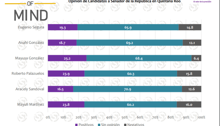 En la pregunta de “¿Por quién de los siguientes candidatos votaría para senador de la República en Quintana Roo?”, Roberto Palazuelos va a la cabeza con el 15.9 por ciento, seguido de Anahí González con 12.1 por ciento, Eugenio Segura con 11.3, Mayuli Martínez con 7.2, Araceli Sandoval con 2.6 y Mayusa González con 2.1 por ciento.