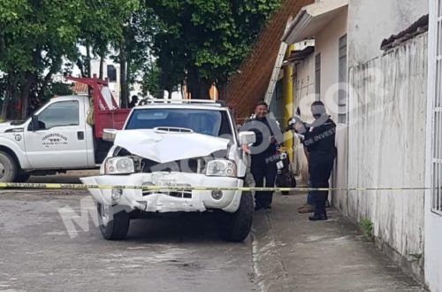 En el lugar la víctima refirió que él llegaba cuando los presuntos ladrones salían de su negocio, ambos estaban armados y realizaron detonaciones hacia el negocio y en contra de la camioneta blanca que ya tenía daños en la parte frontal, dejando a un presunto delincuente sobre la banqueta sin vida.