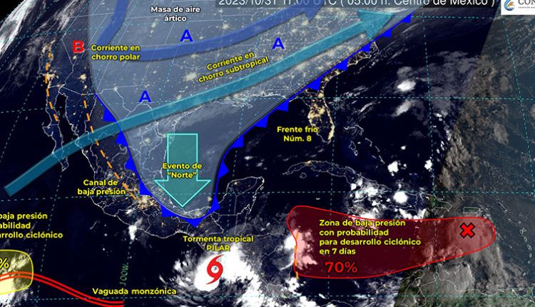 El frente frío interactuará con la circulación de las bandas nubosas de la tormenta tropical Pilar, que se localizará al sur de las costas de Guatemala, mantendrán lluvias puntuales torrenciales en zonas de Veracruz, Oaxaca, Chiapas y Tabasco, lluvias puntuales intensas en Campeche, y lluvias puntuales muy fuertes en Puebla, Yucatán y Quintana Roo, así como chubascos en estados del norte, noreste y centro de la República Mexicana.