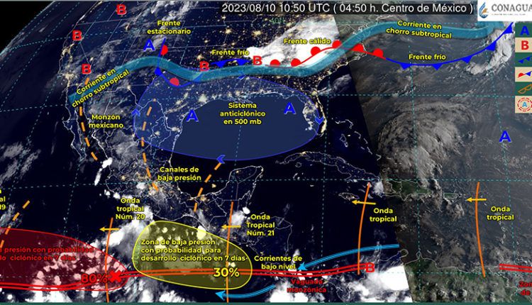 A su vez, el ingreso de humedad del Mar Caribe ocasionará chubascos en la Península de Yucatán.