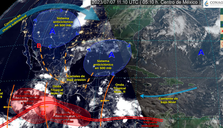 Playa del Carmen, 7 de julio del 2023 (Macropolis QR).- La onda tropical número 11 se aproximará a la Península de Yucatán y el sureste mexicano; y en interacción con un canal de baja presión extendido sobre dichas regiones y con una zona de baja presión con probabilidad para desarrollo ciclónico al sur de las costas de Oaxaca y Guerrero, propiciarán lluvias muy fuertes a puntuales intensas con descargas eléctricas y posible caída de granizo en zonas de Oaxaca, Chiapas y Guerrero; así como fuertes en Veracruz, Tabasco, Campeche, Yucatán y Quintana Roo.