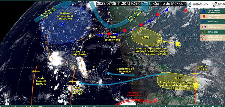 Finalmente, una circulación anticiclónica en niveles medios de la atmósfera sobre el suroeste de Estados Unidos, mantendrá ambiente muy caluroso a extremadamente caluroso con temperaturas máximas superiores a 40 grados sobre estados del noroeste, norte y noreste mexicano, incluida la Península de Yucatán.