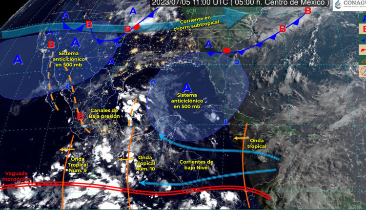 La onda tropical número 9 al sur de la costa de Jalisco, mantendrá la probabilidad de chubascos con lluvias fuertes a puntuales muy fuertes en el occidente del país.