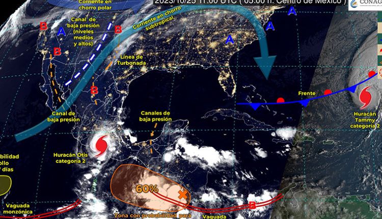A su vez, la corriente en chorro subtropical y otro canal de baja presión en los niveles medios y altos de la atmósfera sobre el norte de México, en combinación con una línea seca que se ubicará al norte de Chihuahua y Coahuila, generarán lluvias puntuales fuertes y rachas de viento con posibles tolvaneras en los estados del noreste del territorio, con probabilidad para la formación de torbellinos en zonas de Coahuila.