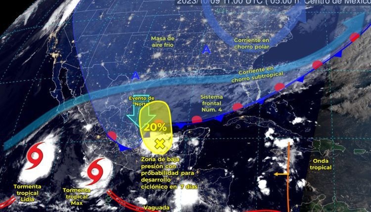 Playa del Carmen, 9 octubre del 2023 (Macropolis QR).- Para hoy lunes, el sistema frontal número 4 se extenderá como estacionario sobre el suroeste del Golfo de México y la Península de Yucatán, donde interaccionará con una zona de baja presión con potencial ciclónico en el sur del Golfo de México, provocando lluvias puntuales intensas en Veracruz, Chiapas y Tabasco; así como lluvias fuertes a muy fuertes en Campeche, Yucatán y Quintana Roo.